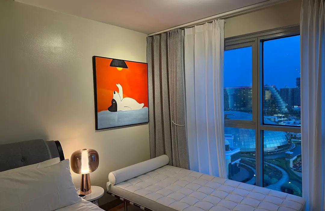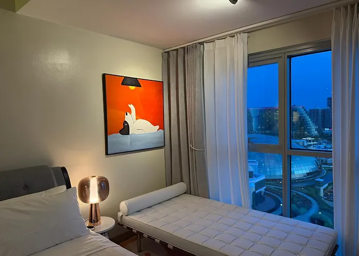 寝室1室の1Brfacing Manilabay Sunsetnear Okada Solaire 1Parkアパートメントはザ・ブルーリーフ・フィリピーナスから1.9kmに位置し、宿泊から自動車で20分離れたブエンディア鉄道駅へ行きやすいです。